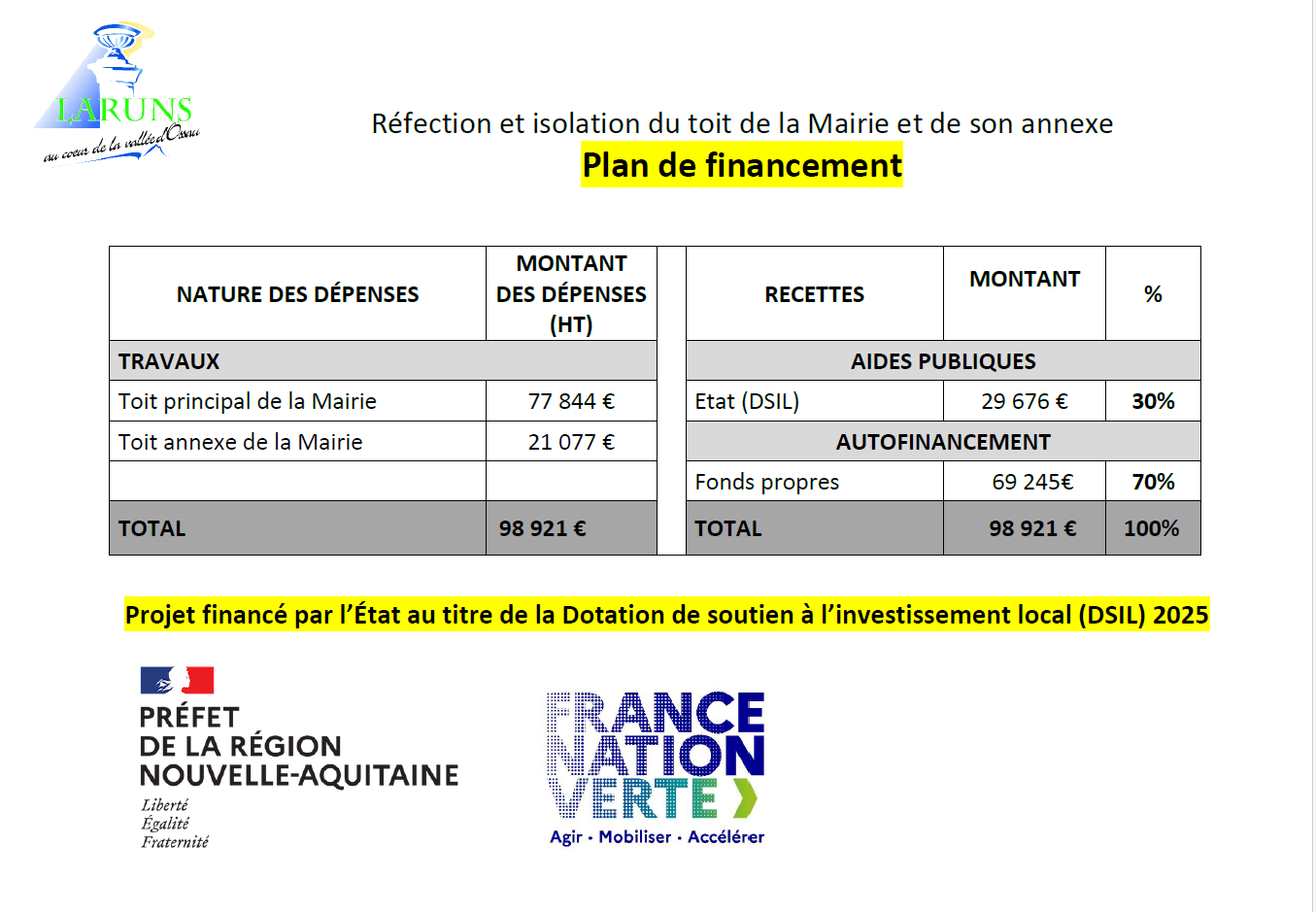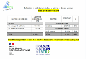 La Mairie a lancé en juin dernier un chantier de réfection et isolation du toit de la Mairie et de son annexe. Après une interruption pendant la saison estivale, la dernière partie du chantier aura lieu cet automne. Cette opération, estimée à 98 921 euros HT, a bénéficié d’une subvention de l’État de 30% (29 676 euros), au titre de la Dotation de soutien à l’investissement local.